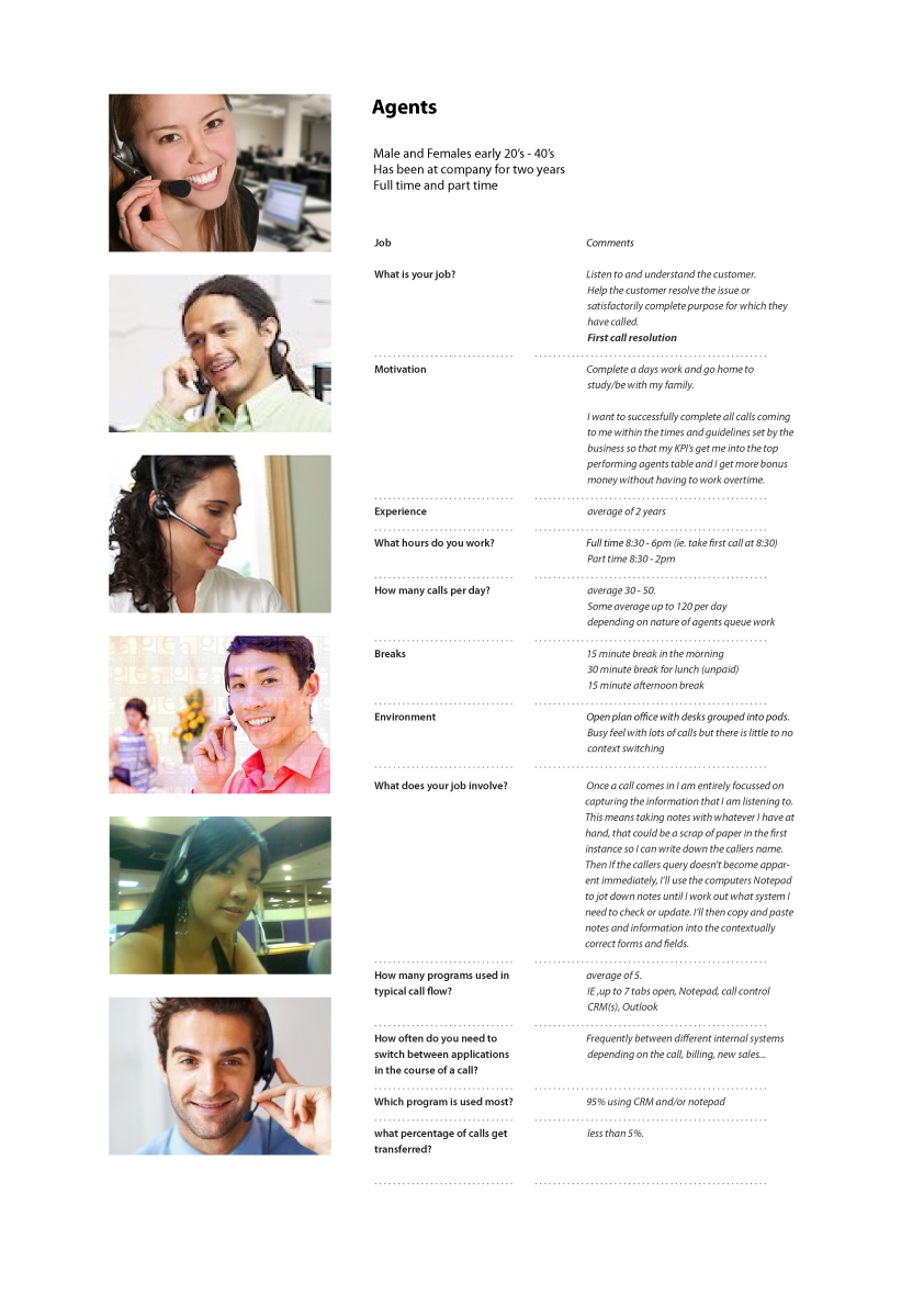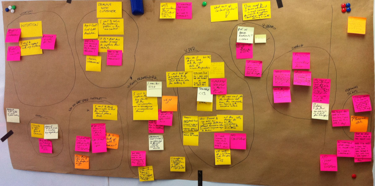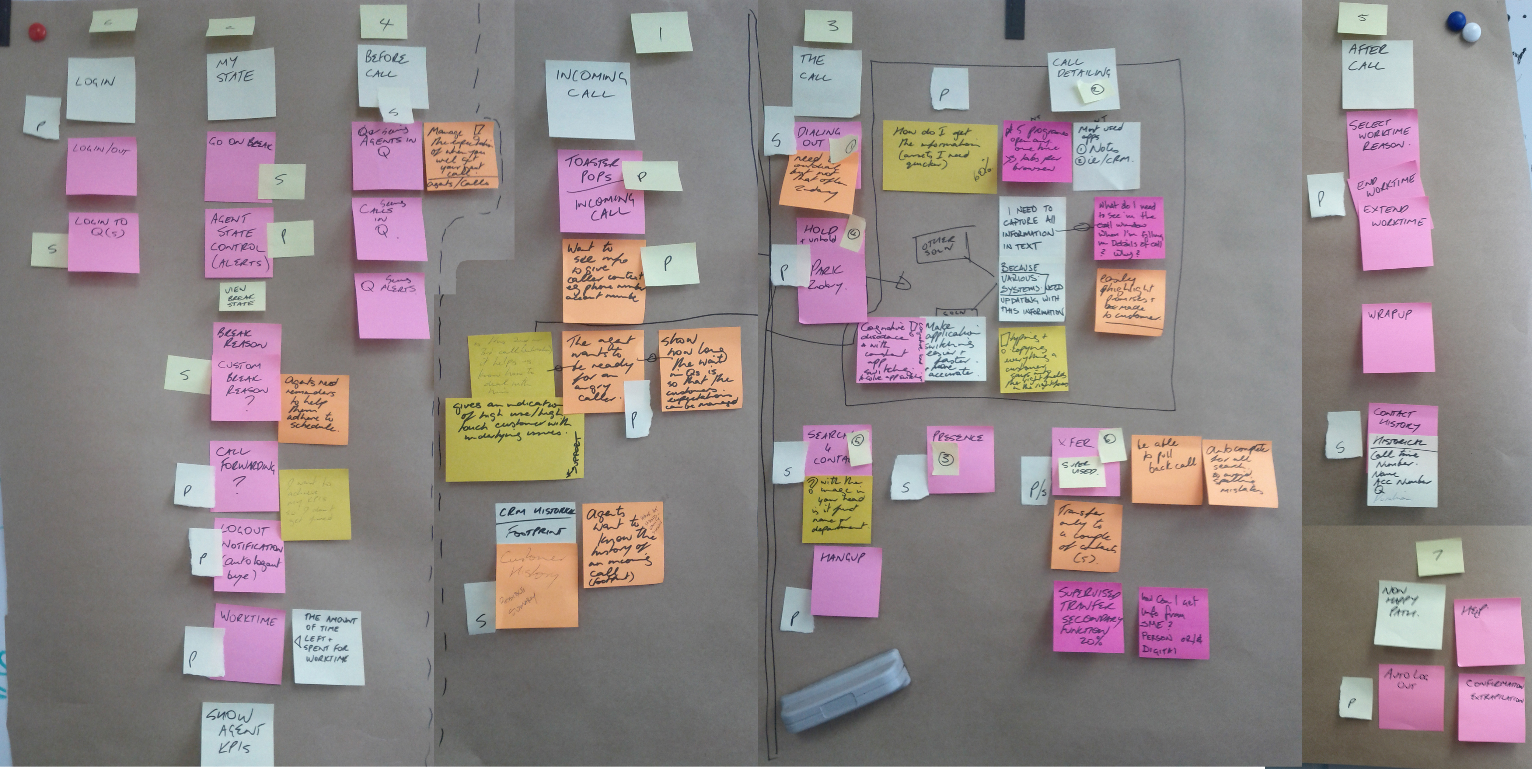 Three of us visited call centres of various high traffic businesses including CourierPost, Yello, Mercury Energy, to sit with and observe an agent each for 90 minutes. We were armed with pages of questions carefully designed to identify an agents work flow, mindset, painpoints, objectives and the reasons behind them.